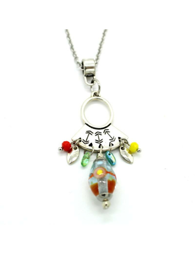 Magnifique mélange de couleurs et de matières pour ce long sautoir, chaine en acier, perle en verre de Murano bleu transparent, décor bleu, corail, vert, jaune, rose fuchsia à l'or, perle en verre de Murano rouge corail, autres perles en verre jaune, rondelles verre corail. Métal anti-allergène (sans nickel, sans plomb et sans cadmium). Longueur : 70 cm + chainette de réglage de 6 cm Poids : 60 g Réf. CO11JE