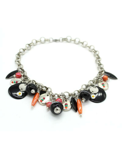 Collier chaine en métal argenté, très belle perle en verre de Murano décor torsade noir/blanc, pampilles en émail noir, autres perles en verre corail, orange, ivoire végétal noir, cabochons en résine jaune, vert, framboise.