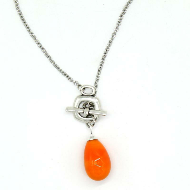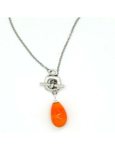 Pendentif grande goutte en verre Murano orange (3,5 cm environ), chaine en acier.