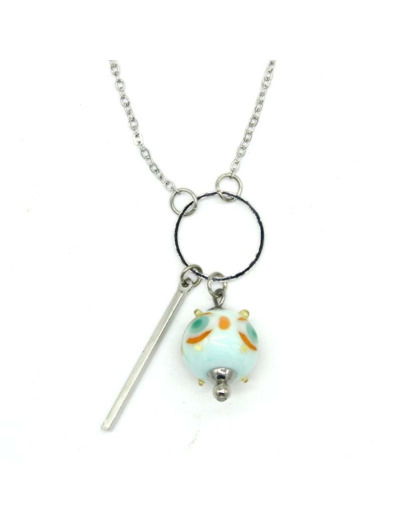 Collier pendentif argenté, perle en verre de Murano mint décor orange, vert pétrole.