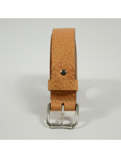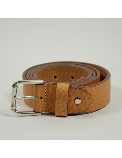 Ceinture en cuir avec un double passant et une boucle argenté rouleau. Coupé franc . Fabriquée main en France à Mazamet. Largeur 35mm.