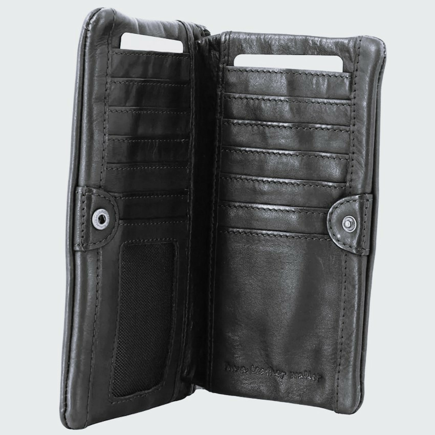 Dimensions : 10 x 17 cm. Matière : cuir de vachette. Fermeture : bouton à pression. Compartiments : 13 fentes pour cartes (1 transparente), 1 poche zippée au dos.