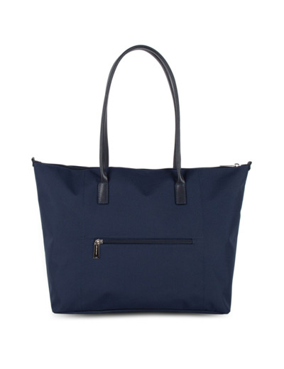 Dimensions et caractéristiques techniques : forme shopping, matière synthétique avec garniture cuir de vachette, fermeture zippée, une poche avant à bouton pression, une poche arrière zippée, anses fixes, porté main ou épaule. Intérieur avec un compartiment principal, une poche zippée, sans poche plaquée ni poche portable.