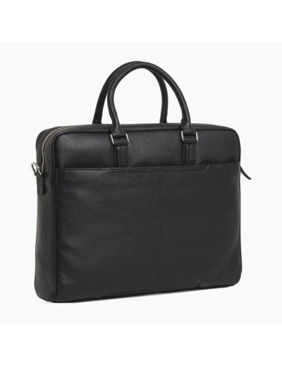 Dimensions : 38 cm de longueur, 31 cm de hauteur, 9 cm de profondeur. Matière : cuir de vachette pleine fleur. Fermeture : zippée. Poches : 1 plate façade, 1 zippée arrière, 1 compartiment principal, 1 poche plaquée moussée intérieure, 1 poche zippée intérieure, 3 porte-stylos. Bandoulière : amovible et réglable. Doublure : textile.
