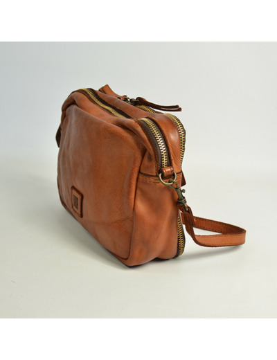 Dimensions : 24 cm de longueur, 16 cm de hauteur, 6 cm de profondeur. Matière : cuir de vache. Fermeture : zip. Bandoulière : réglable et amovible. Compartiments : un intérieur principal, une poche zippée arrière.