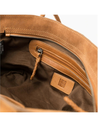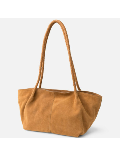 Dimensions compactes de 37 x 15 x 15 cm, cuir de vachette suédé, doublure en coton, fermeture zippée, un compartiment principal avec une poche zippée et une poche plaquée, porté main ou épaule.