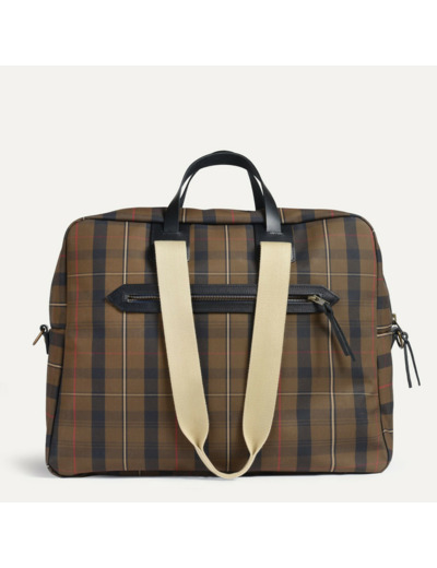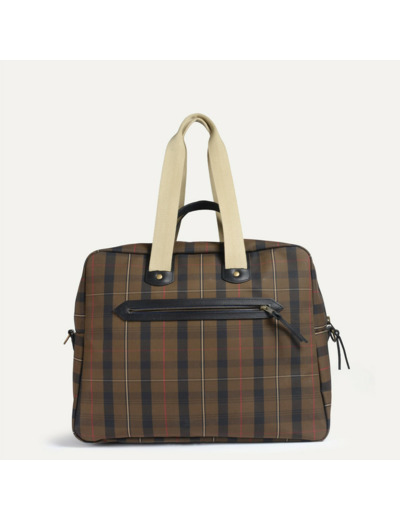 Embarquez avec élégance grâce au sac de voyage cabine Aviateur Missak de Bleu de Chauffe. Alliant cuir noble et toile tartan brun rouge, il incarne un style intemporel et une robustesse à toute épreuve.