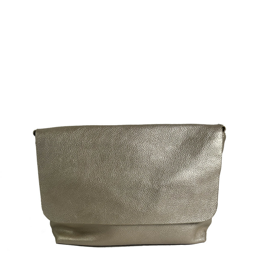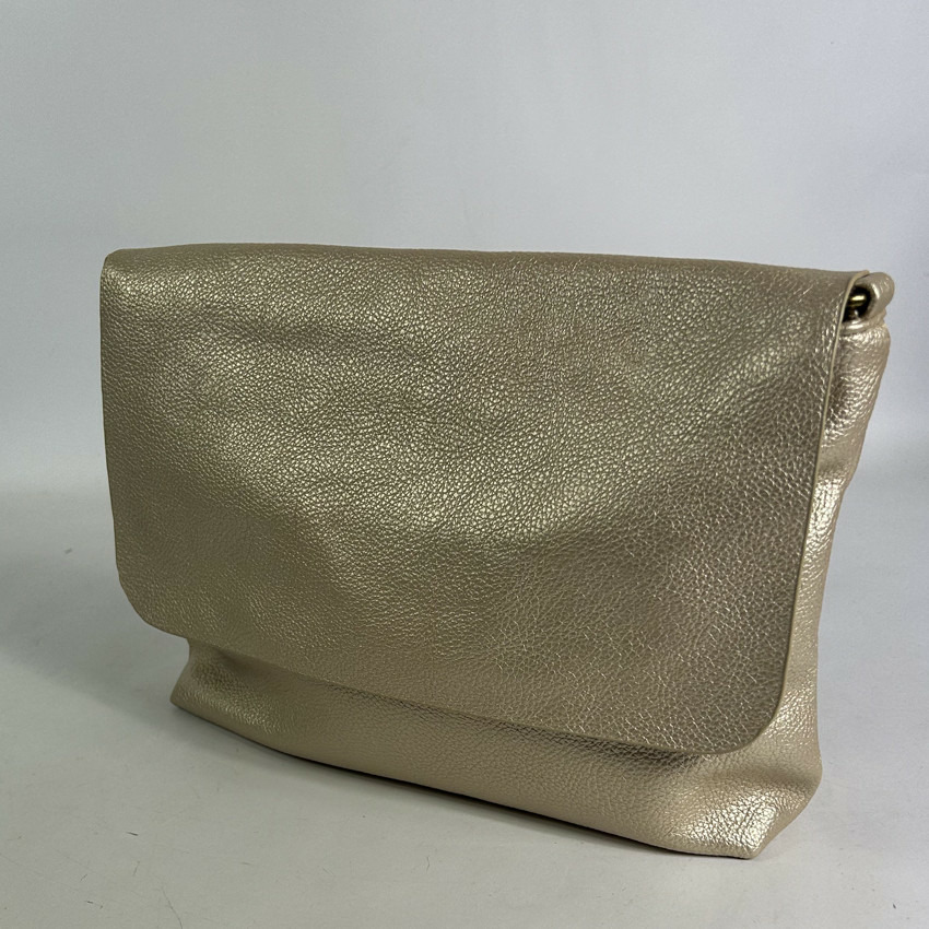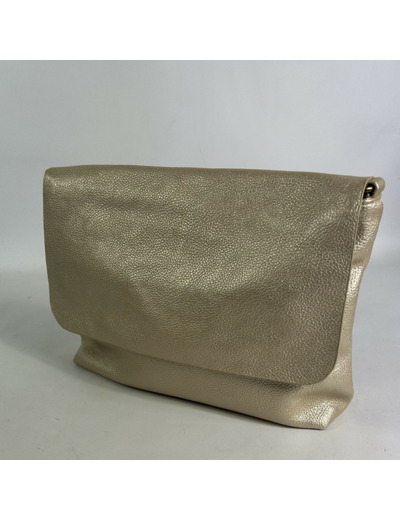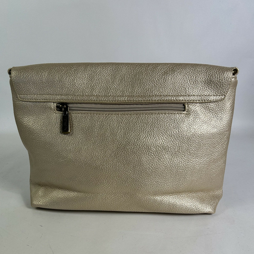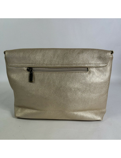 Dimensions : 33 cm de largeur, 20 cm de hauteur, 9 cm de profondeur. Matière : similicuir effet grainé doré. Fermeture : rabat et zip. Poches : 1 zippée extérieure, 2 zippées et 2 plaquées à l’intérieur. Anse : fixe et réglable.