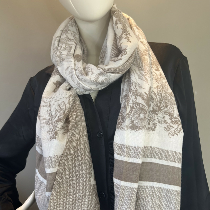 Confectionné dans un mélange doux de viscose et laine, ce foulard offre une sensation agréable sur la peau tout en restant respirant. Sa grande taille permet de le porter de multiples façons, que ce soit noué autour du cou, drapé sur les épaules ou en accessoire de sac, pour un style toujours personnalisé.