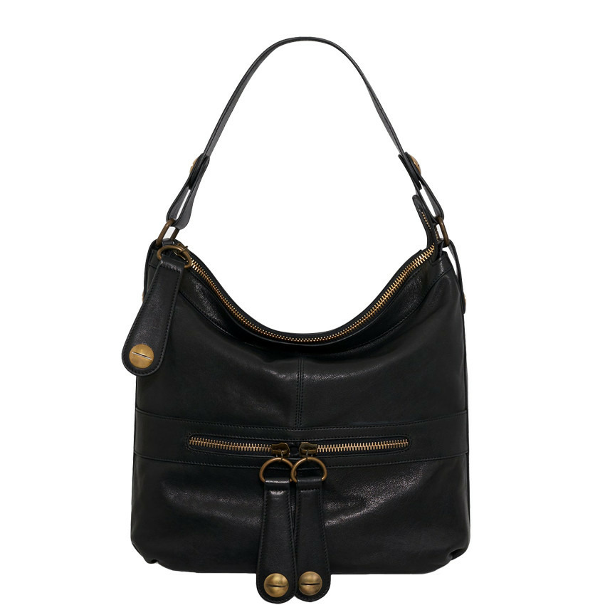 Conçu en cuir de mouton lavé, ce sac affiche une texture douce et authentique qui se patine avec le temps. Sa fermeture zippée oversize et sa métallerie inspirée des vis industrielles apportent une touche contemporaine et affirmée. Compact mais généreux, il se porte aussi bien à la main qu’à l’épaule, s’adaptant à toutes vos envies et tenues.