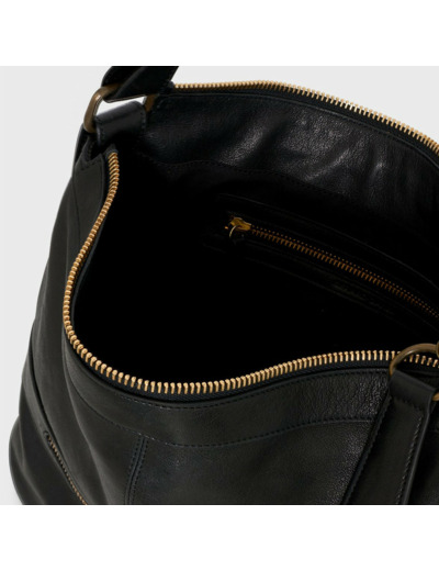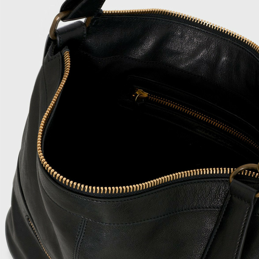 Sac besace en cuir de mouton lavé noir, fermeture zippée oversize, métallerie style vis industrielles. Une poche avant zippée, un compartiment principal avec une poche zippée intérieure. Dimensions : 31 cm de largeur, 31 cm de hauteur, 9 cm de profondeur. Se porte à la main ou court sur l’épaule.