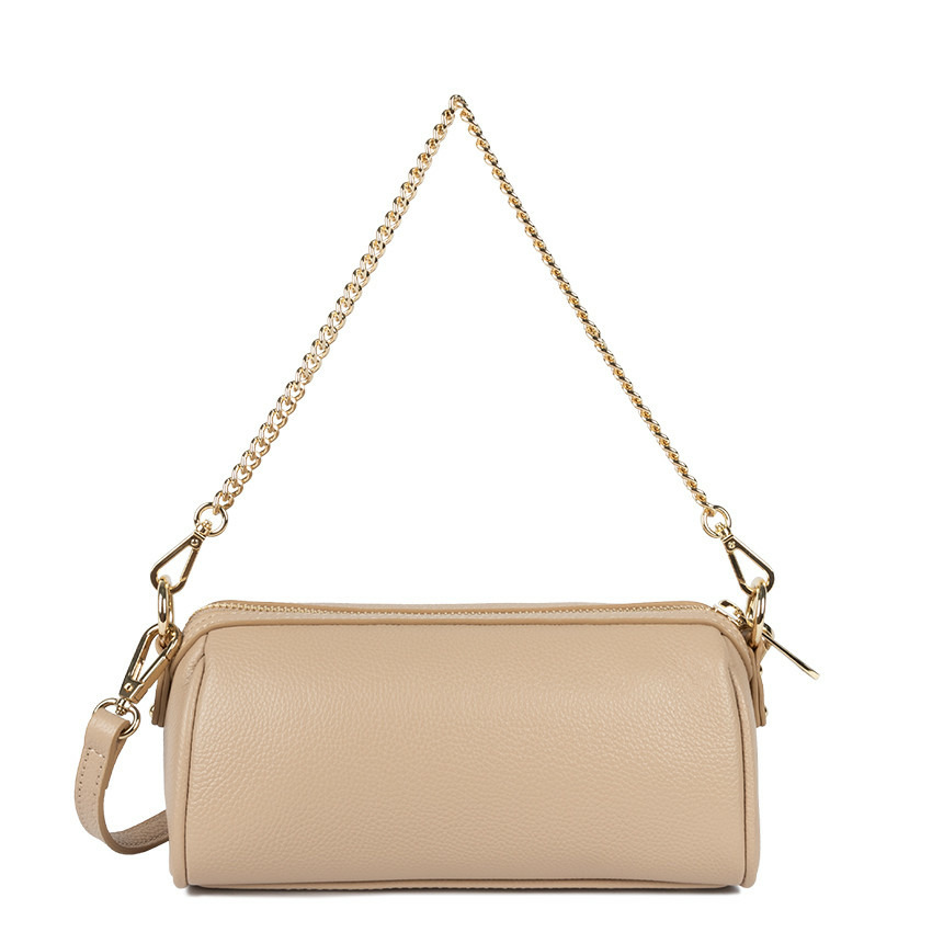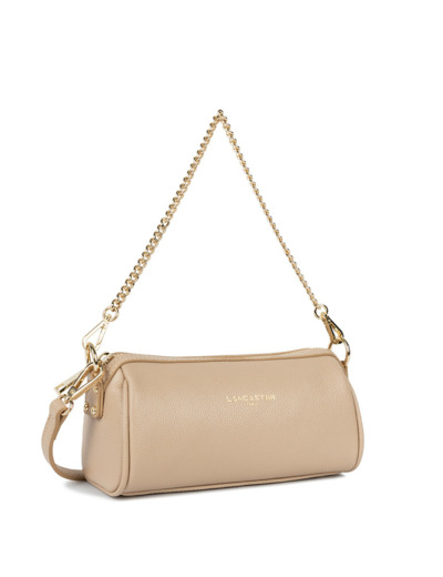 Fabriqué en cuir de vachette beige foncé, le Lancaster Milano Ana présente une fermeture zippée, une anse chaîne amovible non réglable et une bandoulière réglable amovible. Il propose un compartiment principal unique avec une poche zippée intérieure, le tout doublé en textile. Aucun rangement extérieur n’est présent.