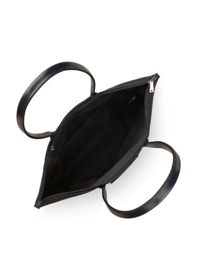 Dimensions pratiques, fermeture zippée, matière synthétique garnie de refente cuir de vachette, anses fixes, porté main ou épaule. Une poche avant à bouton pression, une poche arrière zippée, un compartiment intérieur unique avec une poche zippée.