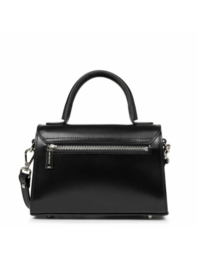 Forme trotteur en cuir de vachette finition lisse. Fermeture par rabat avec bouton aimanté. Anses fixes, bandoulière amovible et réglable. Porté main ou croisé. Intérieur avec un compartiment principal, une poche zippée, deux poches pour téléphone. Poche arrière zippée.