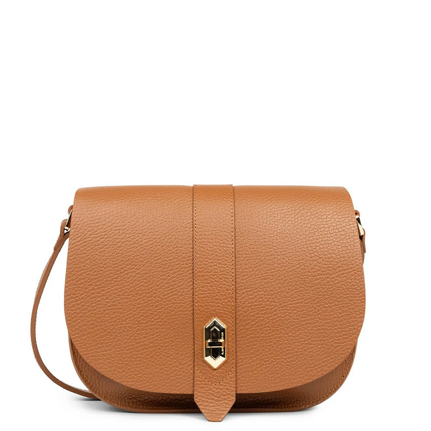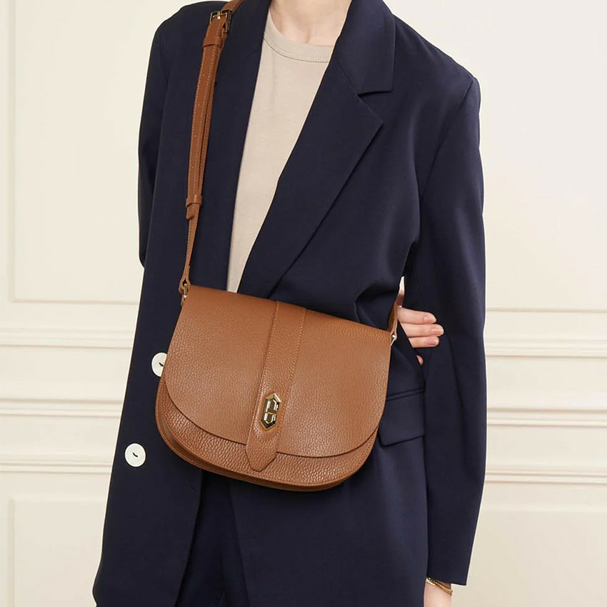 Forme : trotteur. Matière : cuir de vachette pleine fleur. Fermeture : rabat à fermoir. Bandoulière réglable non amovible, portée épaule ou travers. Intérieur : 1 compartiment, 1 poche plaquée, 1 poche portable, 1 poche zippée. Doublure en cuir de vachette. Pas de poches extérieures.