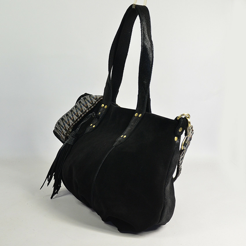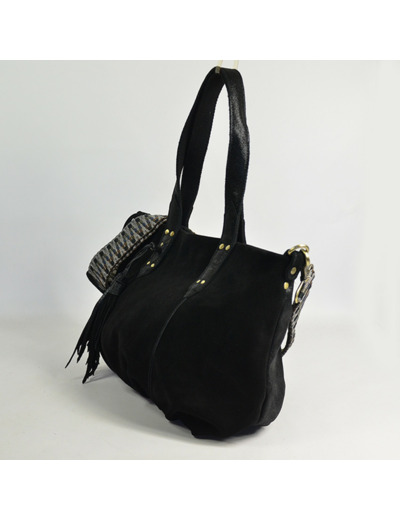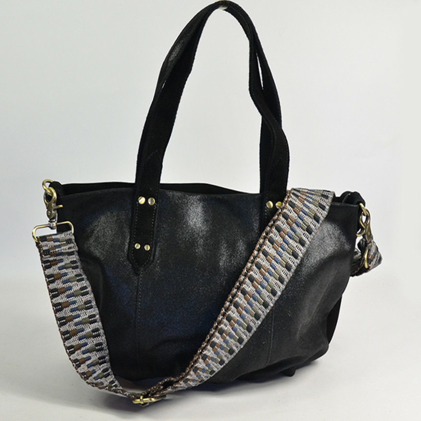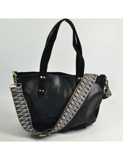 Forme cabas en cuir noir, fermeture zippée, bandoulière réglable et amovible, une seule poche intérieure zippée, une poche plaquée et un mousqueton. Pas de poches extérieures. Porté main, sous le bras ou croisé.
