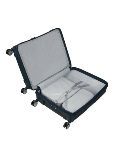Dimensions : 67 x 47 x 30 cm (extensible à 33 cm), volume 71/81 L, poids 3,9 kg. Garantie mondiale limitée de 5 ans. Matériau : polypropylène recyclé. Équipée de roues à suspension, fermeture zippée avec code TSA, poignées haute, latérale et de traction double tube, poche frontale, plateau séparateur fixe et amovible avec poche imperméable, sangles, compartiments pour ordinateur, poches pour liquides, mesh pocket, support Airtag, et deux housses de rangement (taille S et M).